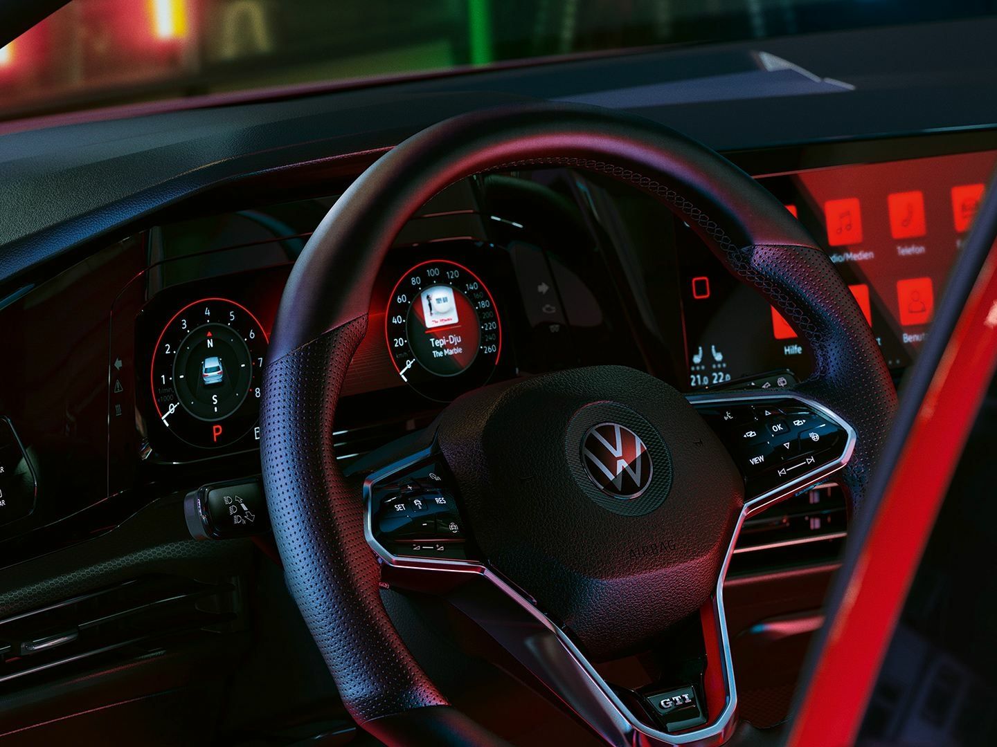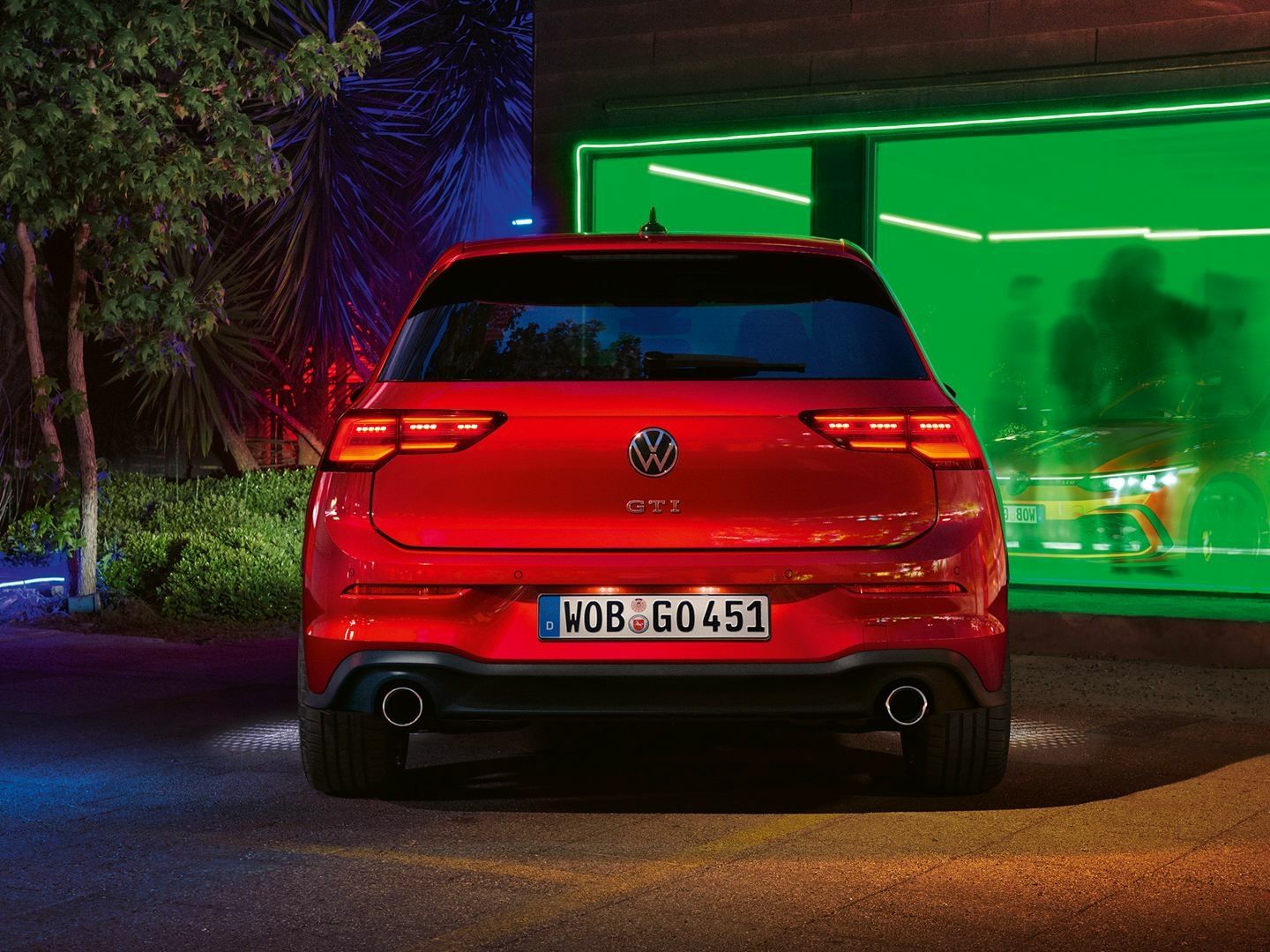 Wenn sich eine rote Linie über die Front zieht und der Kühlergrill mit Wabenstruktur und schwarzen Lufteinlässen versehen ist – dann kann auf den Schriftzügen nur eines geschrieben stehen: GTI. Schmale LED-Scheinwerfer, ein markant-dynamischer Stoßfänger und verbreiterte Seitenschweller verleihen der Sportlichkeit dieses legendären Fahrzeugs noch mehr Ausdruck. Am Heck dürfen der Dachkantenspoiler und die verchromten Endrohre definitiv nicht fehlen, während LED-Rückleuchten das einzigartige Erscheinungsbild abrunden.
