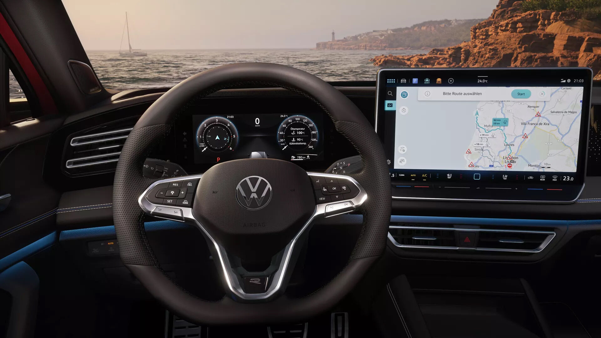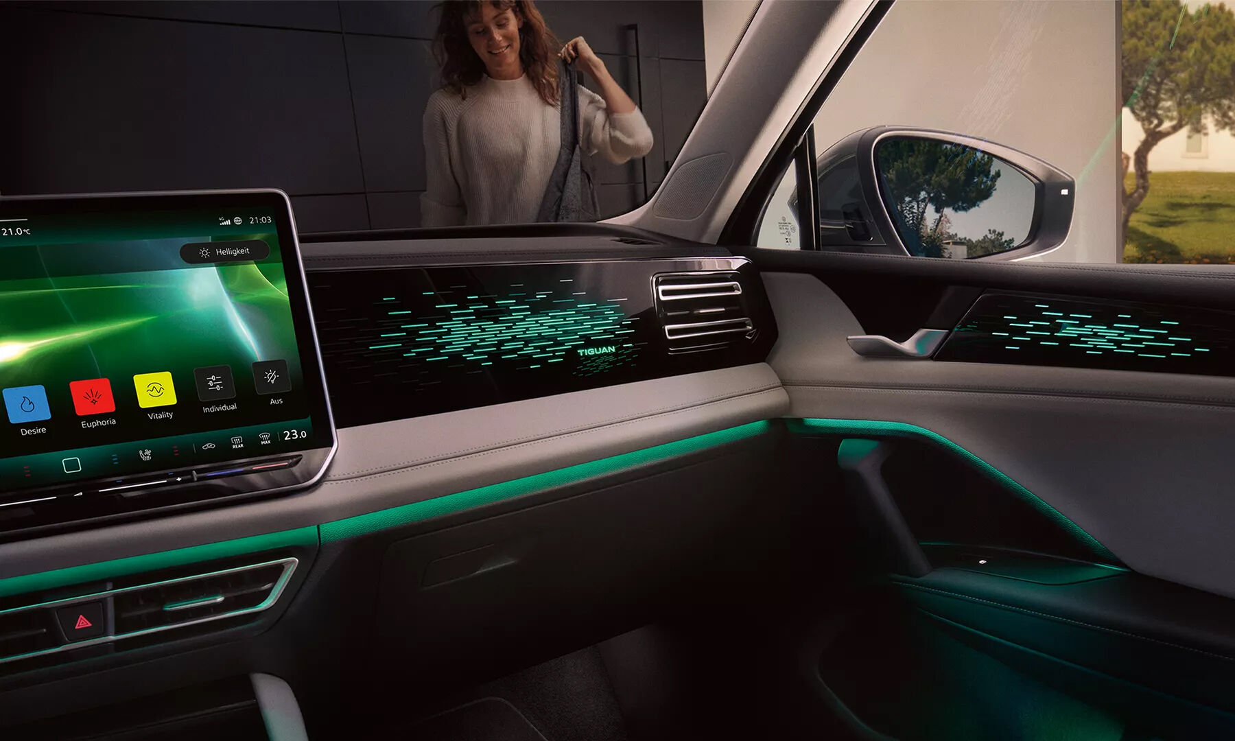 Den Innenraum des neuen Tiguan können Sie ausstattungsabhängig mit nur einem Fingertipp sanft zum Leuchten bringen. Dabei können Sie aus bis zu 30 Farben wählen. Mehrere Lichtleisten sowie durchleuchtete Dekore sorgen für Ihre persönliche Lichtatmosphäre. Besondere Highlights: je nach Ausstattungslinie das illuminierte R-Line Logo bzw. der beleuchtete Tiguan Schriftzug auf der Armaturentafel.1